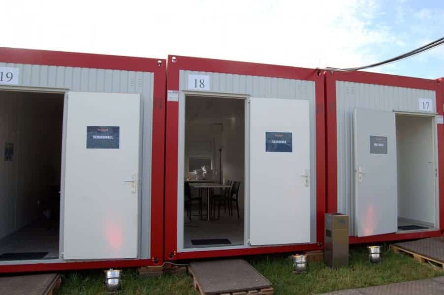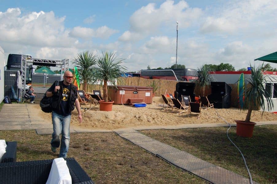 Wir spielen heute bereits um 17 Uhr und bilden gemeinsam mit Emil Bulls (16 Uhr) und Eisbrecher (15 Uhr) das bayerische Nachmittagsgewitter. Im Backstagebereich stehen unsere 3 Container auch noch nebeneinander und so liegt es nahe, dass wir dort die bayerische Flagge hissen. Na gut, hissen ist etwas übertrieben, aber zumindest mit Gaffa an die Wände kleben. Davor hat Tanja ihren Privatplanschbeckenpool aufgebaut, allerdings ist es heute im Gegensatz zu gestern doch recht kühl und es weht ein frischer Wind, sodass nur wenige Füße den Weg ins Wasser finden.