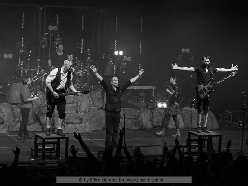 Jetzt geht’s los: Das Intro läuft, die Melodiefraktion beginnt mit „vor der Schlacht“ und mit dem Einsatz der Herren im Hintergrund fällt der große Vorhang. Die Show läuft! Und wie! Es macht unheimlich Spaß, Thomas ist in Hochform und holt die Fans allesamt ab und wir dürfen gemeinsam in 2 wunderbare Stunden Auszeit abtauchen. Herrlich J